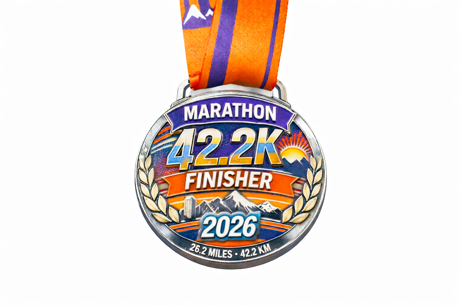 Denne eksklusive maratonmedaljen er utviklet for løpsarrangementer som ønsker en medalje med tydelig identitet og profesjonelt preg. Medaljen har et detaljert design med fjellmotiv, soloppgang og klassiske laurbærgrener som symboliserer prestasjon, utholdenhet og måloppnåelse.